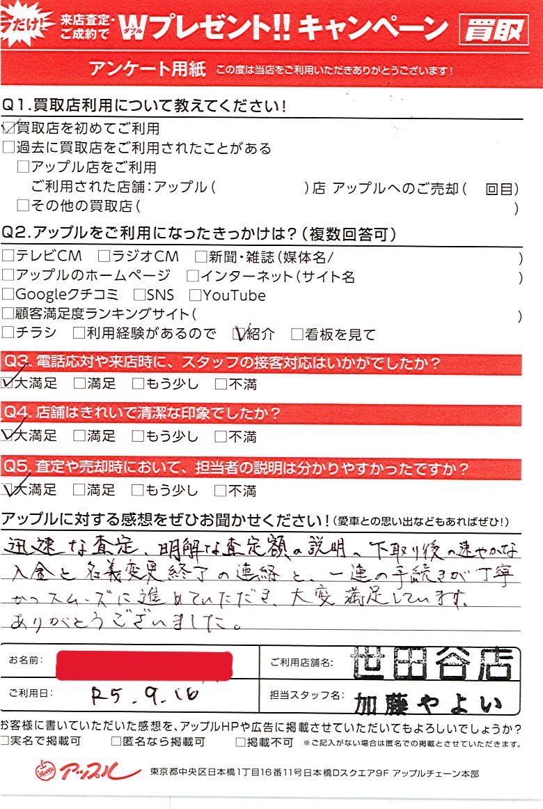 東京都世田谷区 アンケート用紙より N様 車名:BMW 2シリーズアクティブツアラー