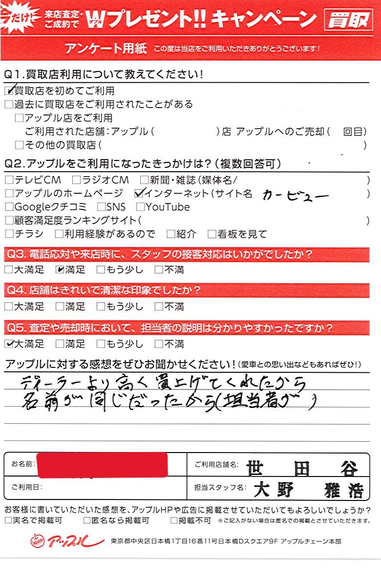 東京都大田区 アンケート用紙より O様 車名:トヨタ ハリアー (H25年12月~のハイブリッド含む)