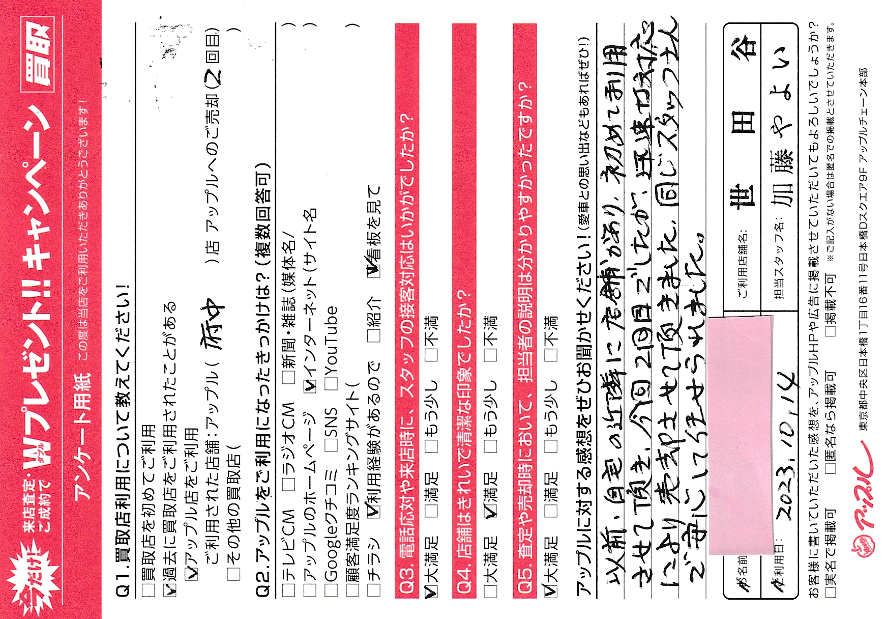 ご利用日 2023/10/14 担当:加藤