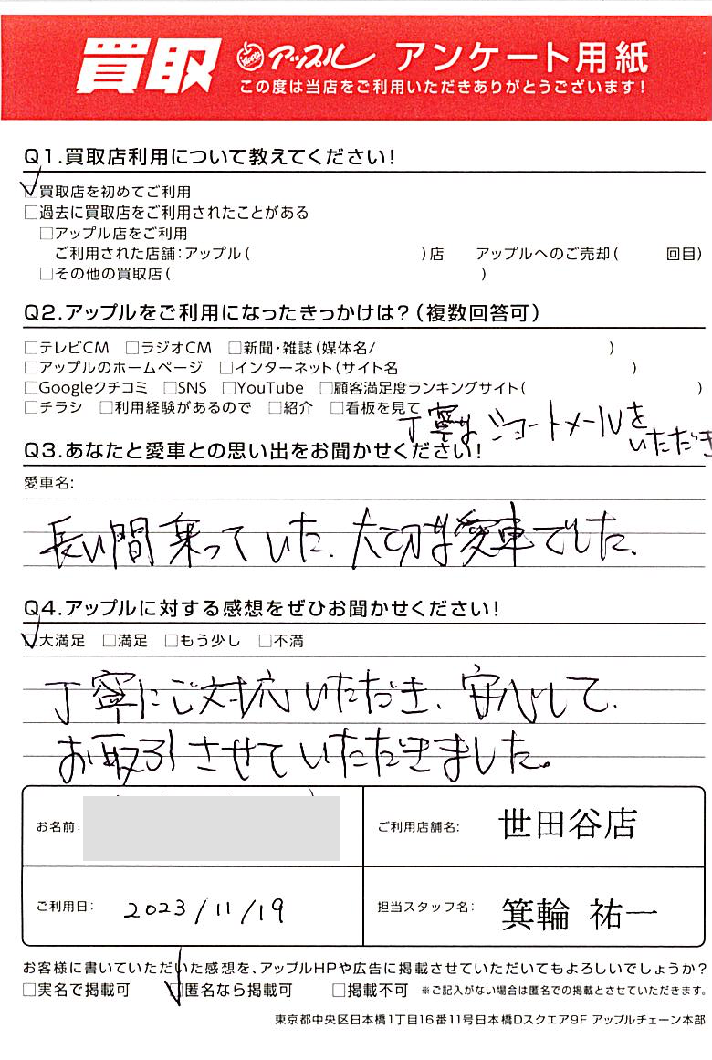 東京都杉並区 アンケート用紙より Y様 車名:トヨタ ブレイド