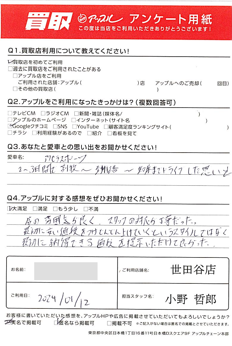 東京都杉並区 アンケート用紙より Y様 車名:マツダ アクセラスポーツ