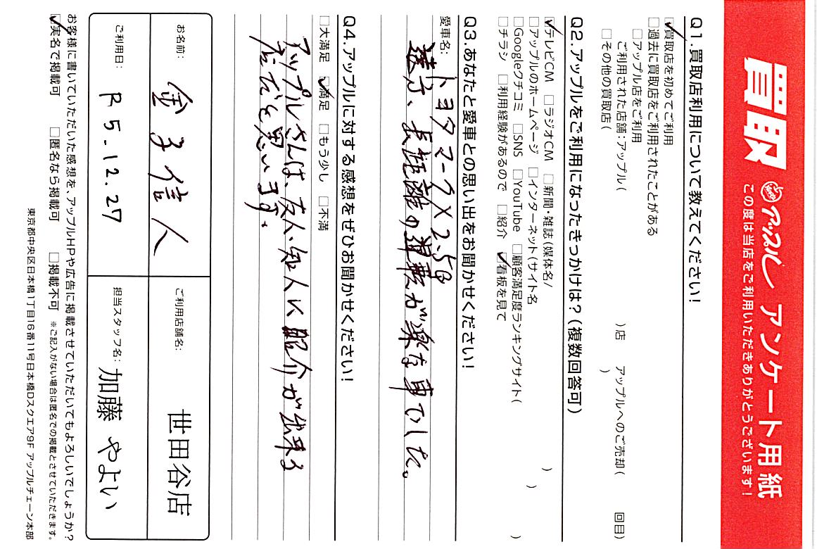 東京都大田区 アンケート用紙より 金子 信人様 車名:トヨタ マークX
