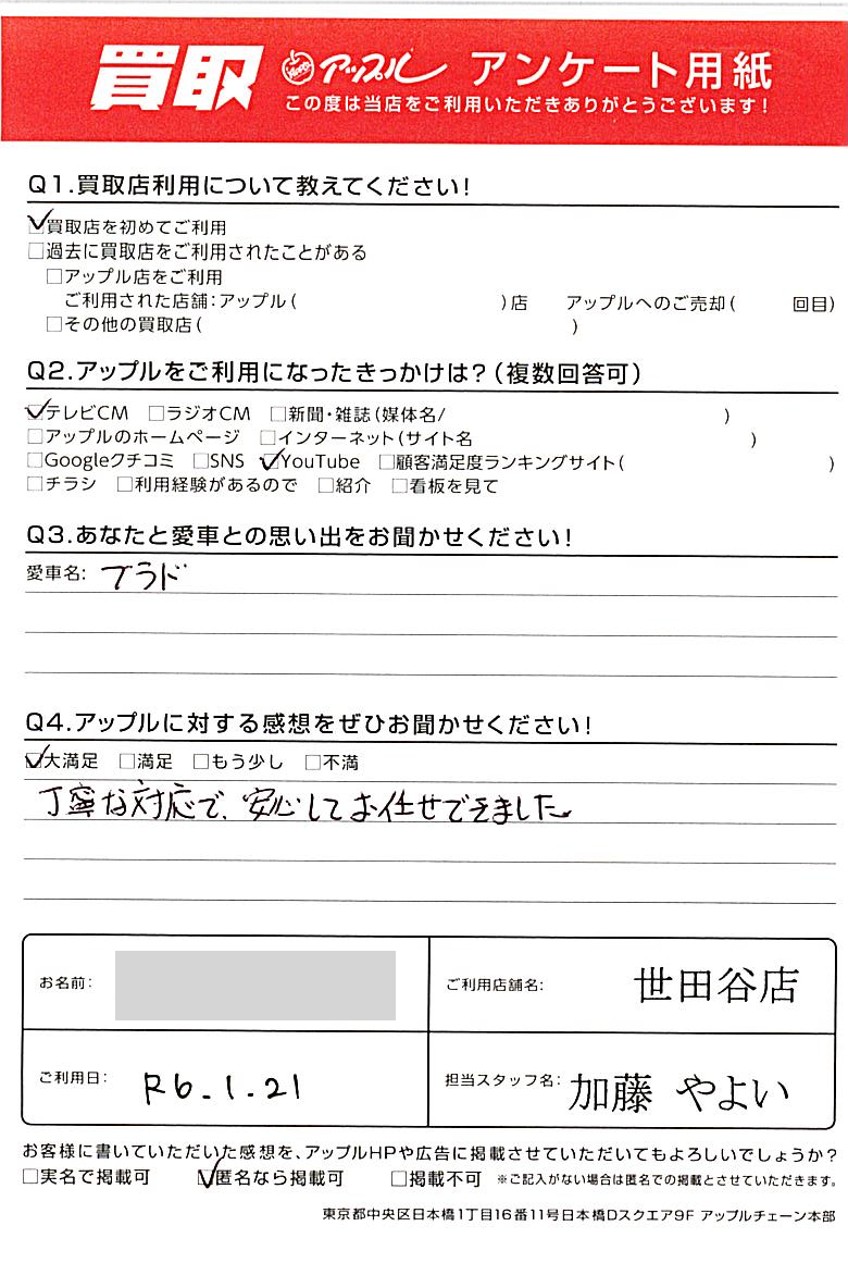 東京都世田谷区 アンケート用紙より T様 車名:トヨタ ランドクルーザープラド