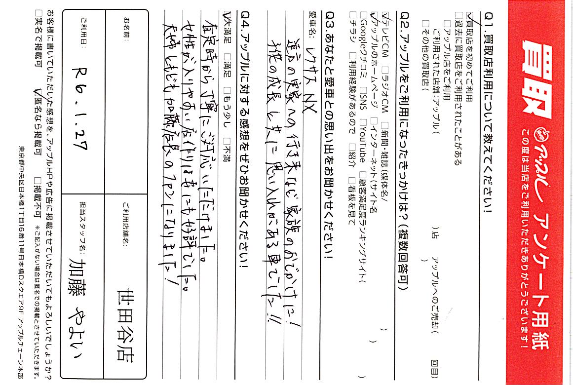 神奈川県横浜市 アンケート用紙より様 車名:レクサス NX (国内仕様 右H)