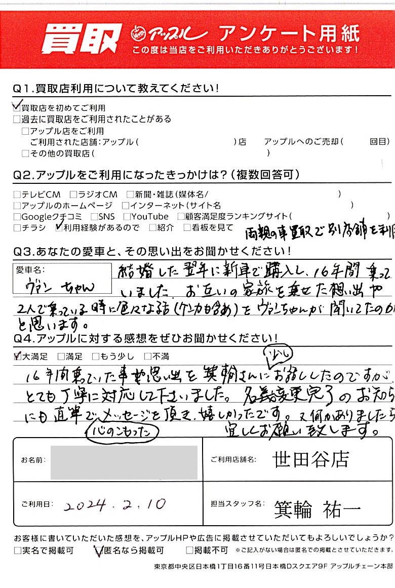 東京都杉並区 アンケート用紙より I様 車名:トヨタ ヴァンガード