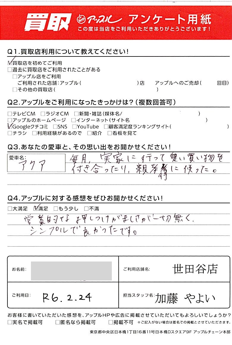 東京都世田谷区 アンケート用紙より K様 車名:トヨタ アクア