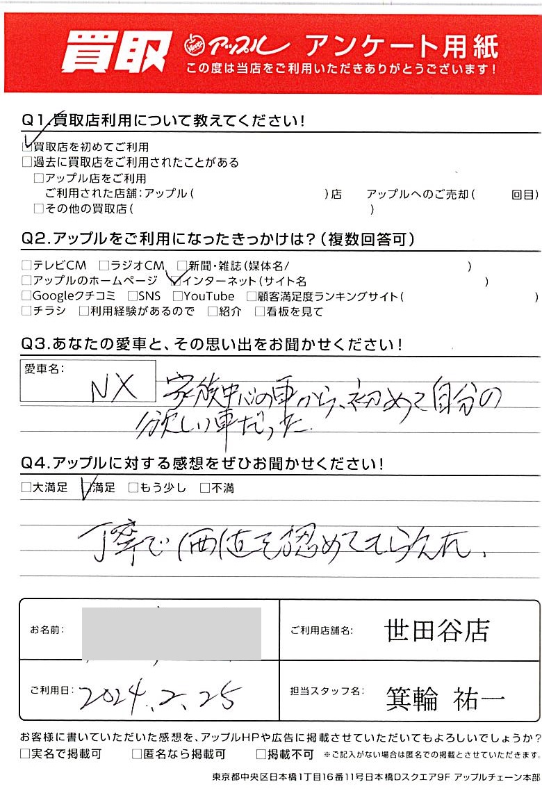 東京都世田谷区 アンケート用紙より O様 車名:レクサス NX (国内仕様 右H)