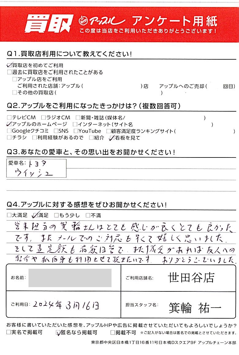 東京都世田谷区 アンケート用紙より K様 車名:トヨタ ウィッシュ