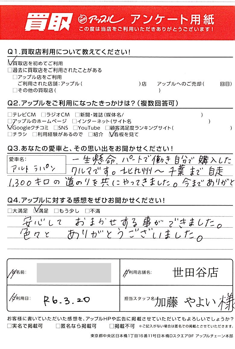 東京都世田谷区 アンケート用紙より Y様 車名:スズキ アルトラパン ラパン(アルト)