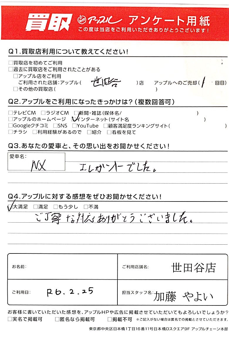 東京都 アンケート用紙より様 車名:レクサス NX (国内仕様 右H)