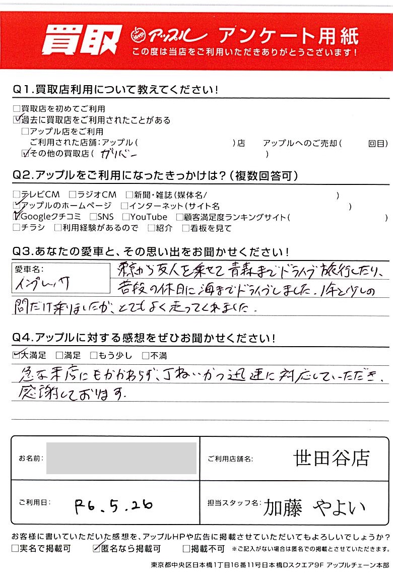 東京都中野区 アンケート用紙より K様 車名:スバル インプレッサスポーツ