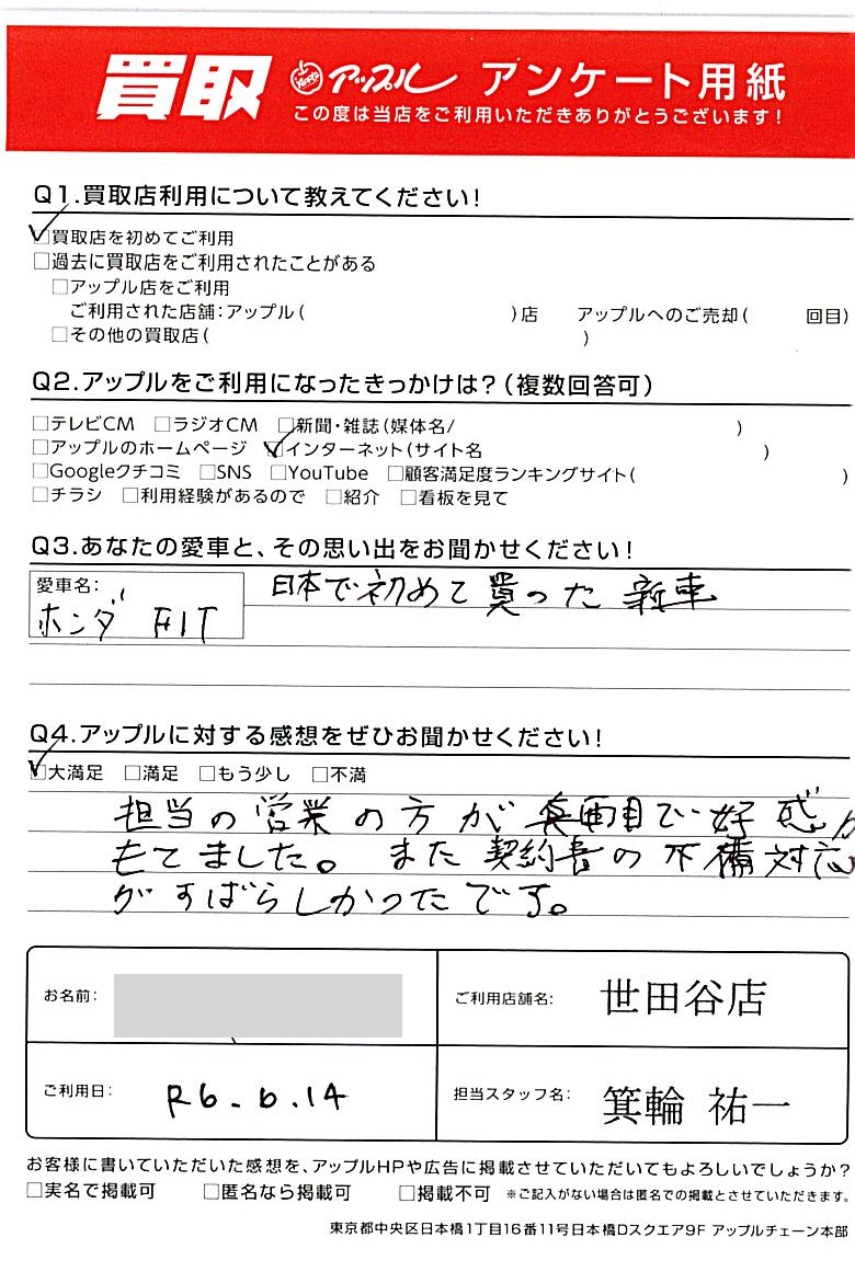埼玉県川口市 アンケート用紙より U様 車名:ホンダ フィット(H25年9月以降のハイブリッド含む)