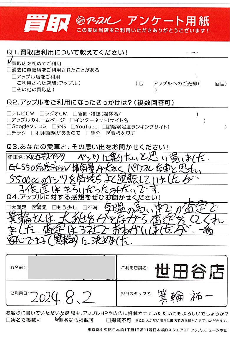 東京都大田区 アンケート用紙より H様 車名:メルセデス・ベンツ GLクラス