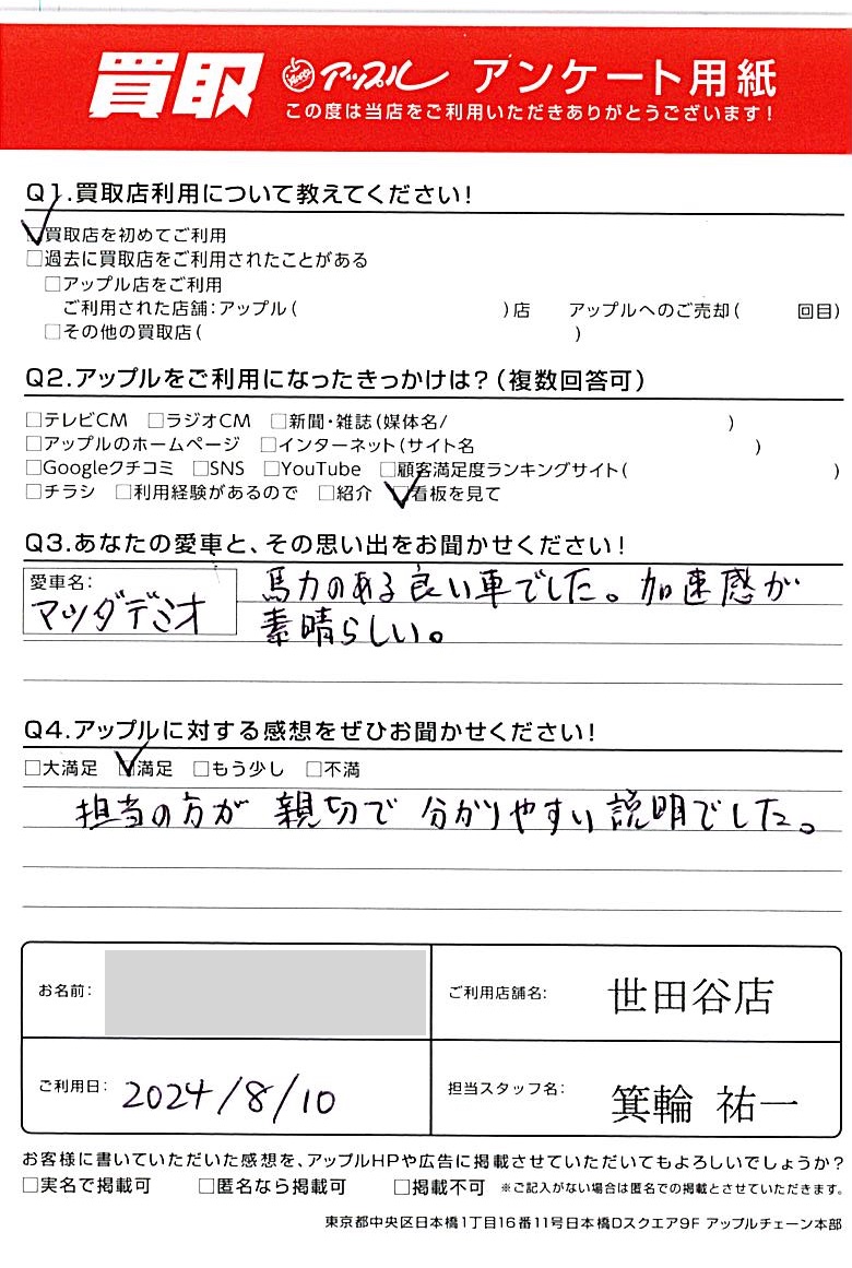 東京都調布市 アンケート用紙より様 車名:マツダ デミオ