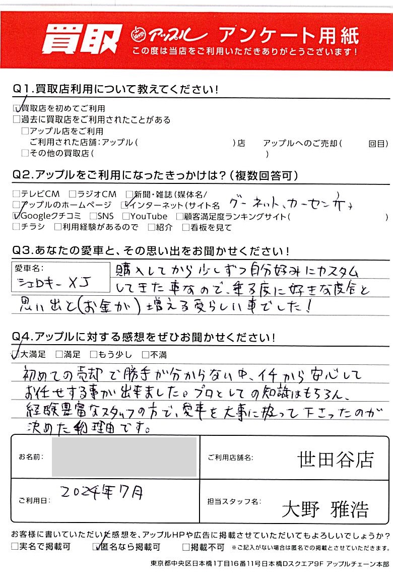 東京都世田谷区 アンケート用紙より K様 車名:ジープ チェロキー