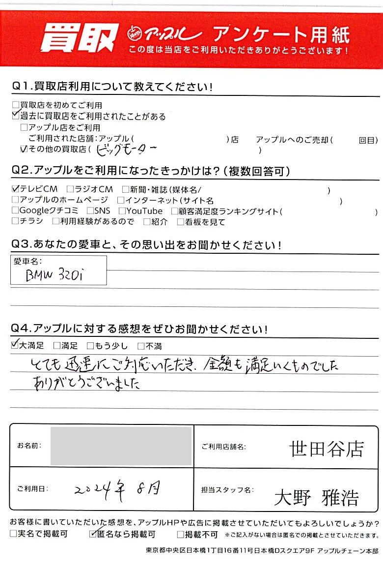 東京都大田区 アンケート用紙より H様 車名:BMW 3シリーズセダン