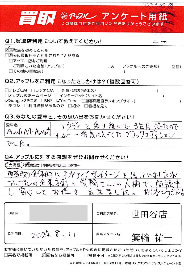 東京都府中市 アンケート用紙より W様 車名:アウディ A4アバント