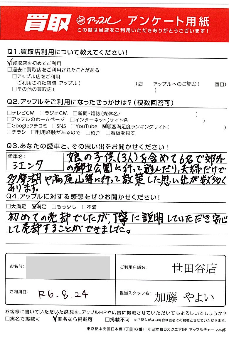 東京都渋谷区 アンケート用紙より O様 車名:トヨタ シエンタ