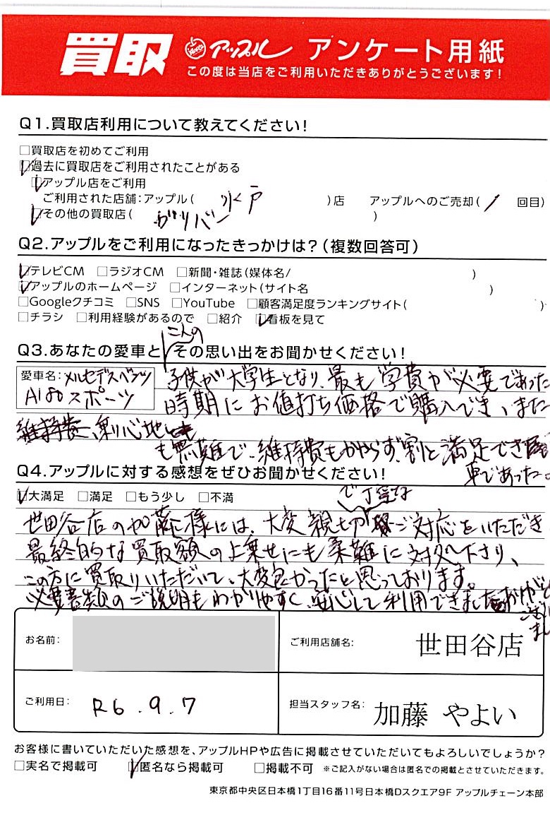 東京都府中市 アンケート用紙より K様 車名:メルセデス・ベンツ Aクラス
