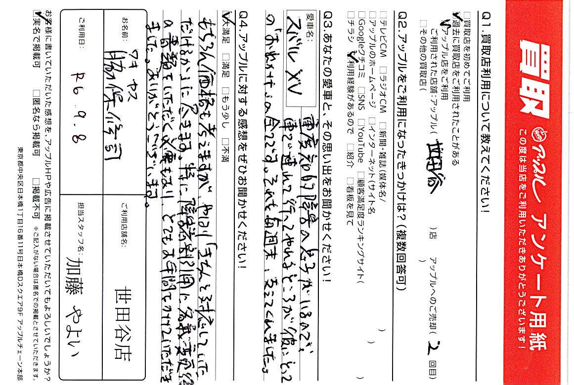 東京都 アンケート用紙より 脇保修司様 車名:スバル XV (2017年5月~)