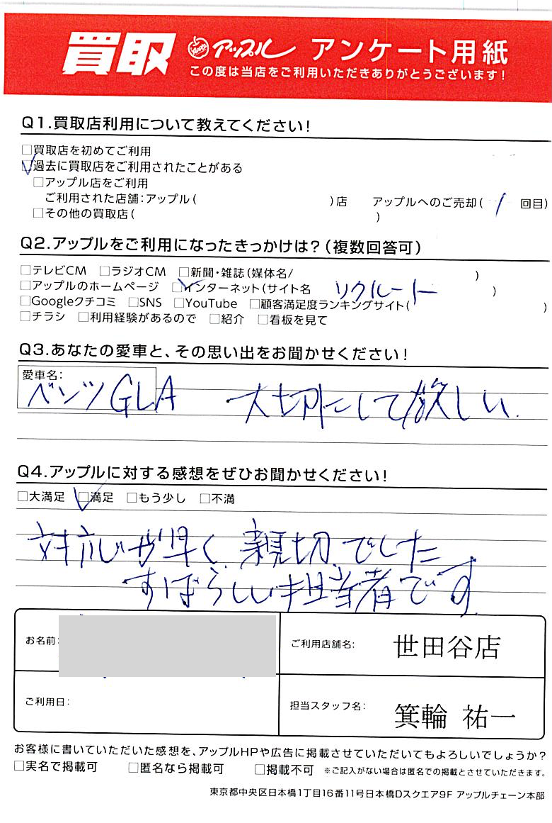 東京都渋谷区 アンケート用紙より T様 車名:メルセデス・ベンツ GLAクラス