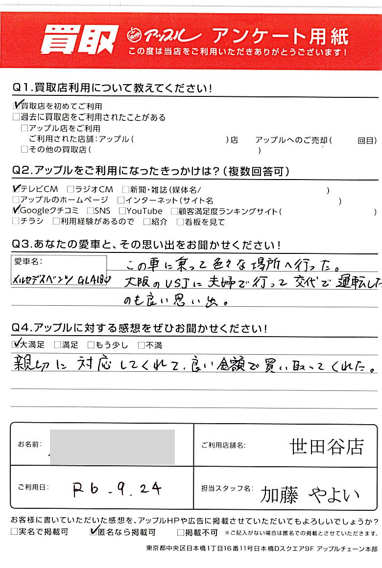 東京都世田谷区 アンケート用紙より O様 車名:メルセデスAMG GLAクラス