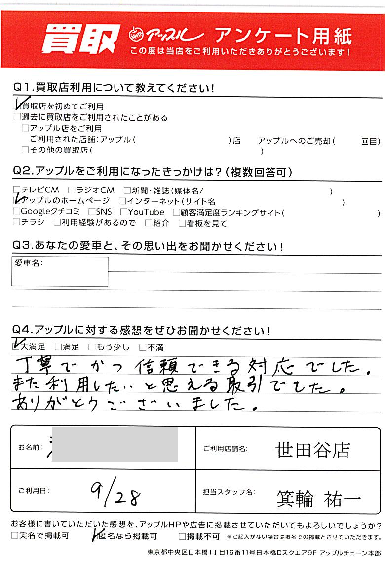 東京都世田谷区 アンケート用紙より W様 車名:トヨタ RAV4(R04年10月~RAV4 PHV含む)