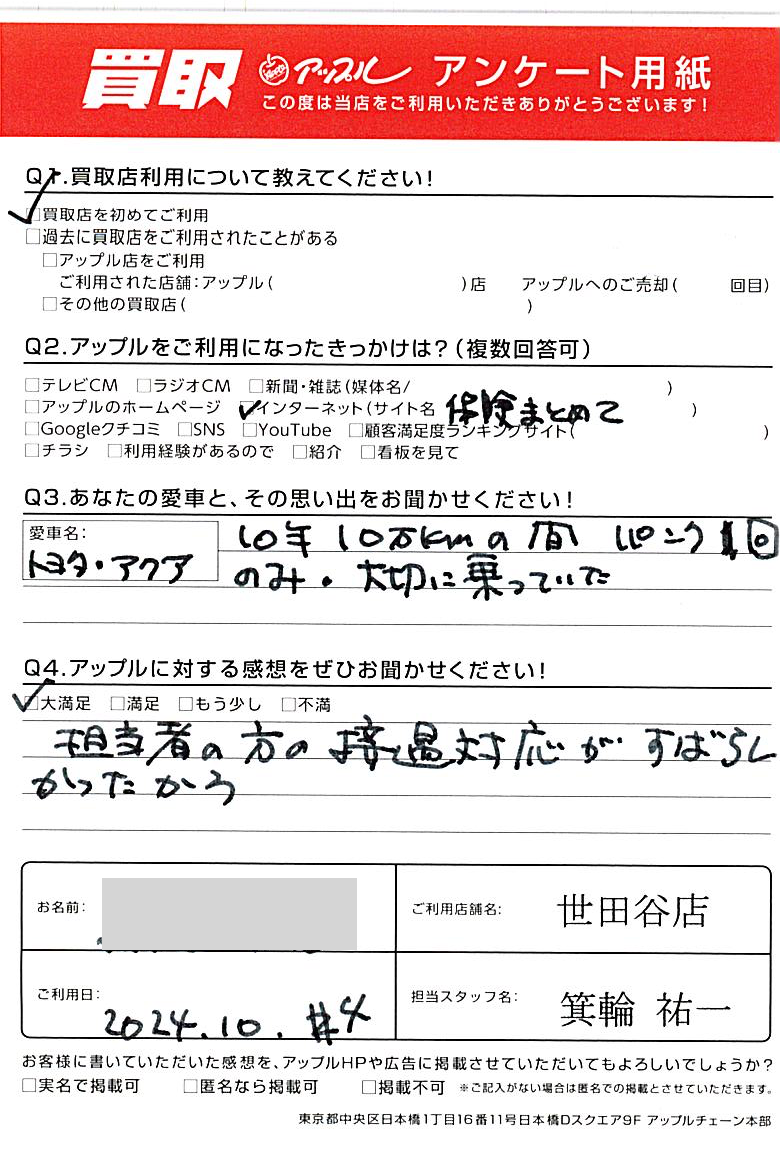 東京都世田谷区 アンケート用紙より K様 車名:トヨタ アクア