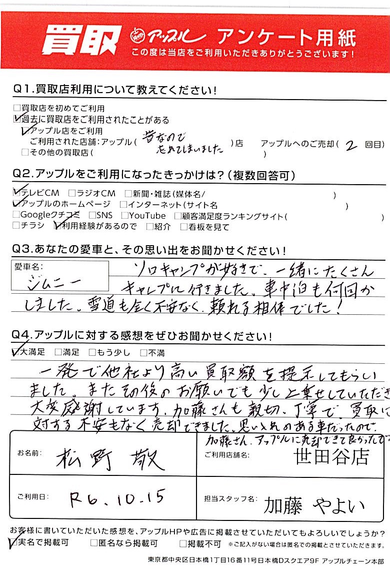 東京都 アンケート用紙より 松野 敬様 車名:スズキ ジムニー
