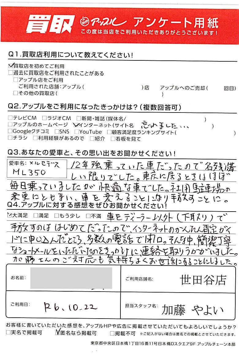 東京都目黒区 アンケート用紙より E様 車名:メルセデスAMG Mクラス