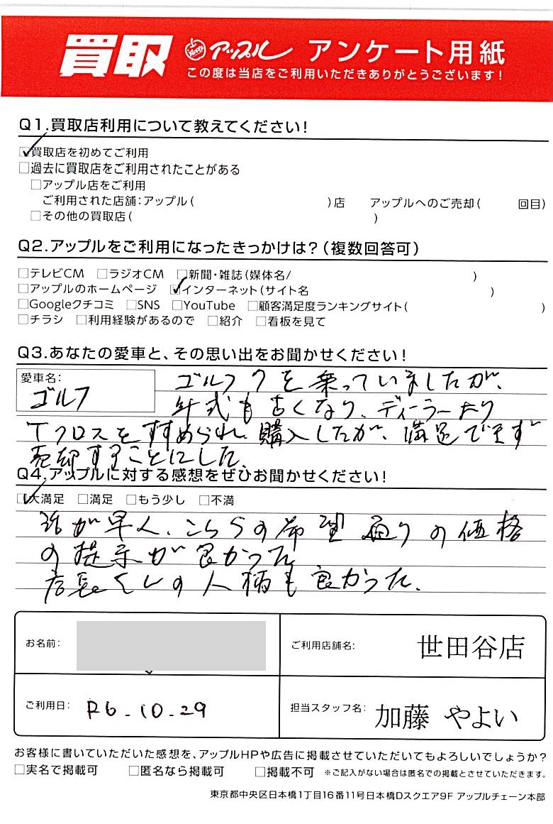 東京都杉並区 アンケート用紙より S様 車名:フォルクスワーゲン T-Cross