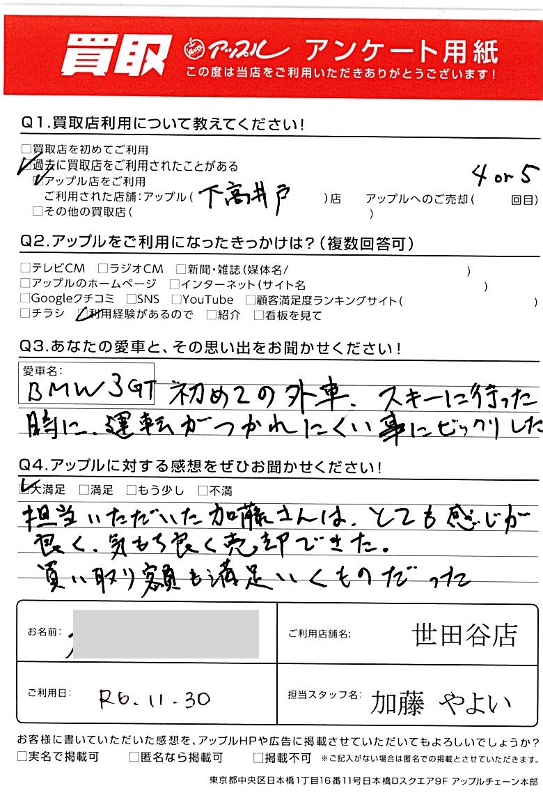 東京都世田谷区 アンケート用紙より O様 車名:BMW 3シリーズグランツーリスモ
