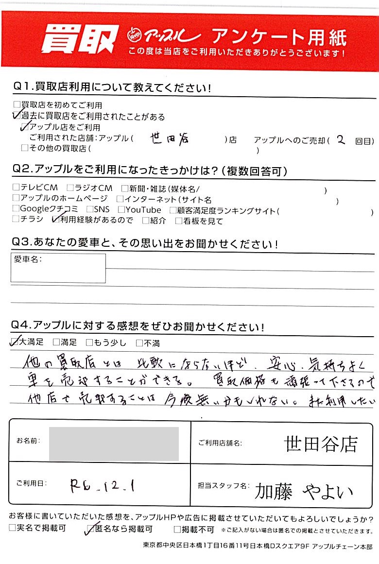 他の買取店とは比較にならないほど、安心して気持ちよく車を売却することができる。