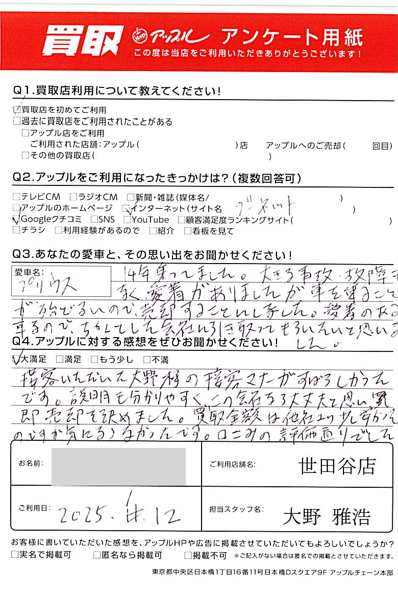 千葉県 アンケート用紙より T様 車名:トヨタ プリウス(2023年3月~のPHVを含む)