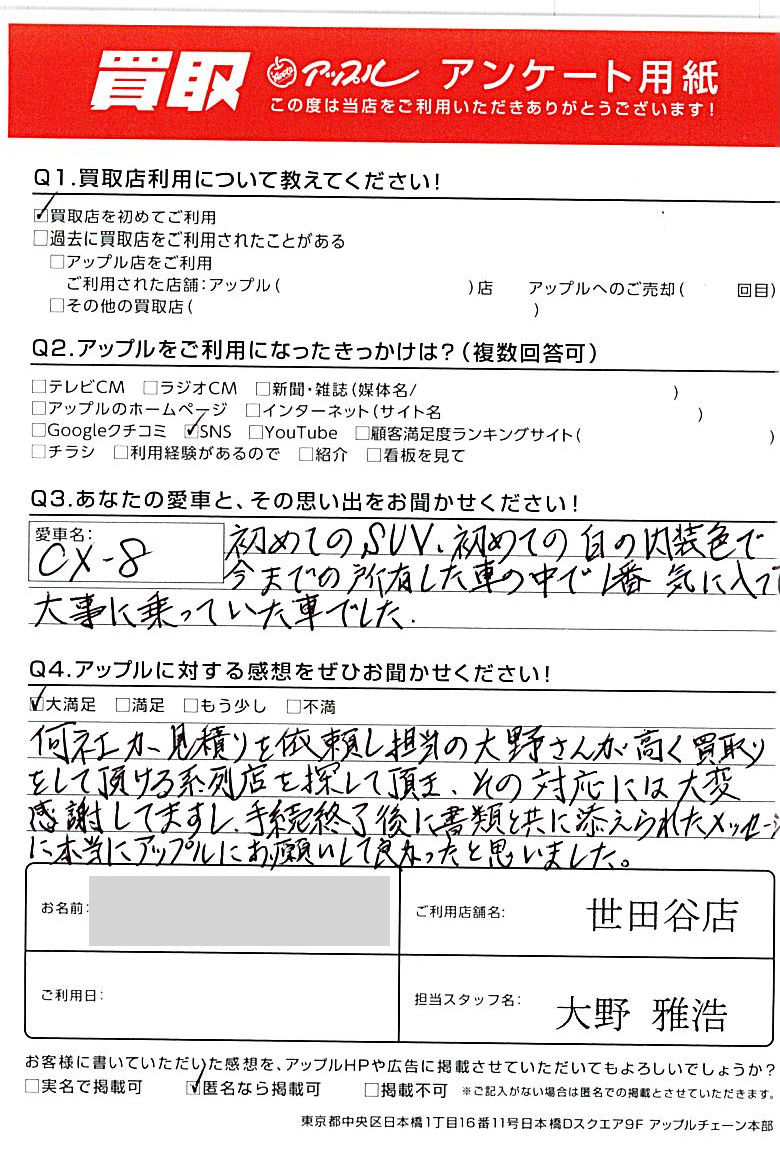 東京都渋谷区 アンケート用紙より K様  車名:マツダ CX-8
