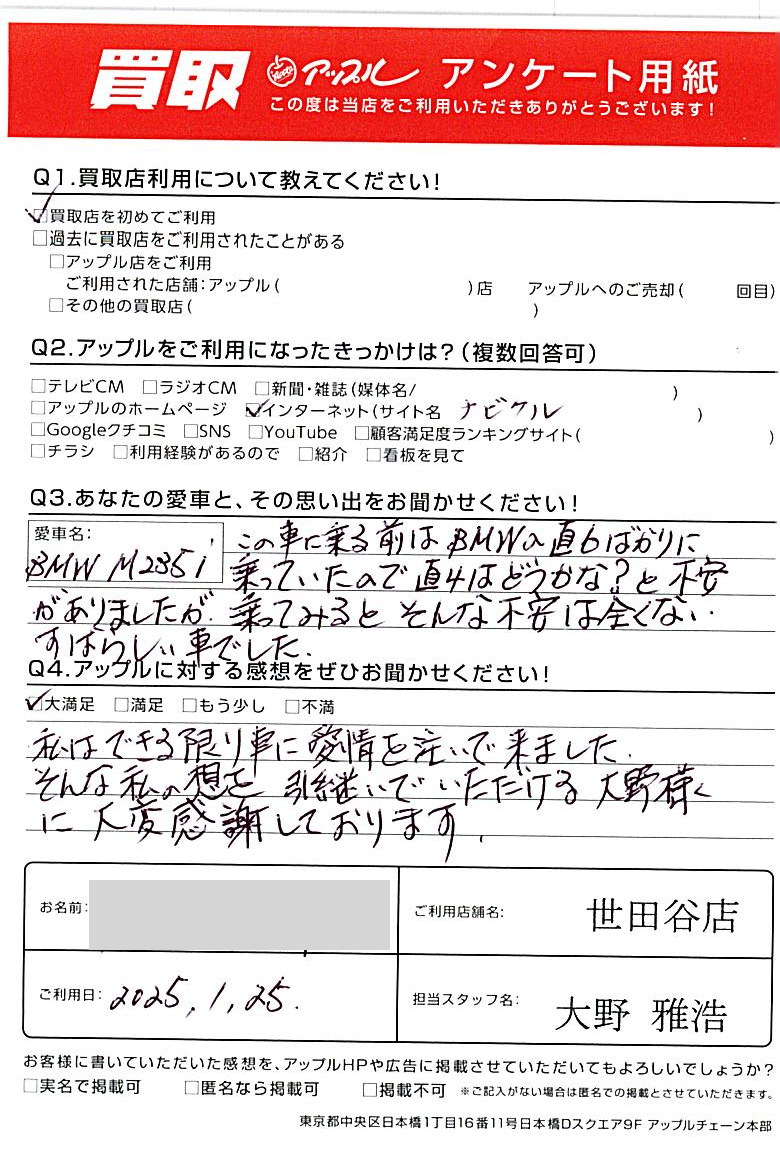 東京都渋谷区 アンケート用紙より W様 車名:BMW 2シリーズグランクーペ