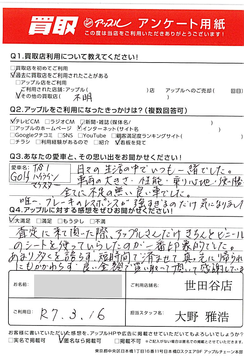 東京都目黒区 アンケート用紙より I様 車名:フォルクスワーゲン ゴルフ