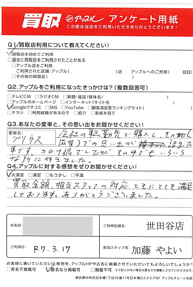 東京都世田谷区 アンケート用紙より I様 車名:トヨタ プリウス(2023年3月~のPHVを含む)