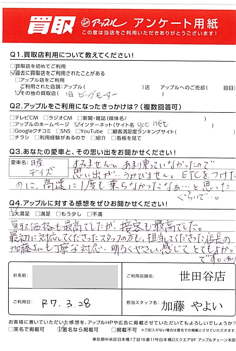 東京都杉並区 アンケート用紙より K様 車名:日産 デイズ