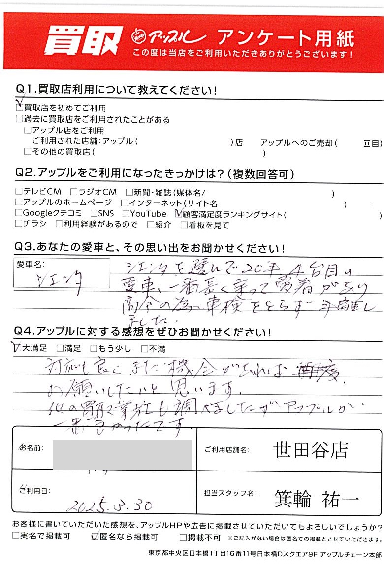 東京都杉並区 アンケート用紙より A様 車名:トヨタ シエンタ