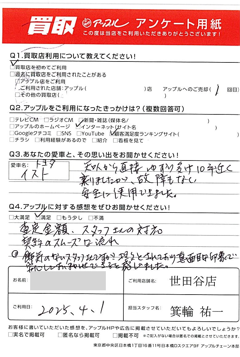 東京都世田谷区 アンケート用紙より O様 車名:トヨタ ist