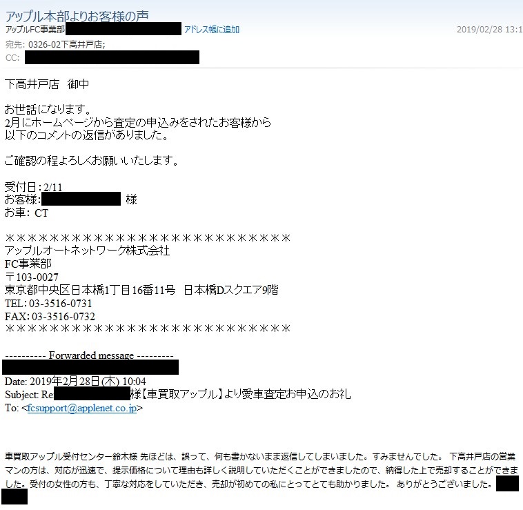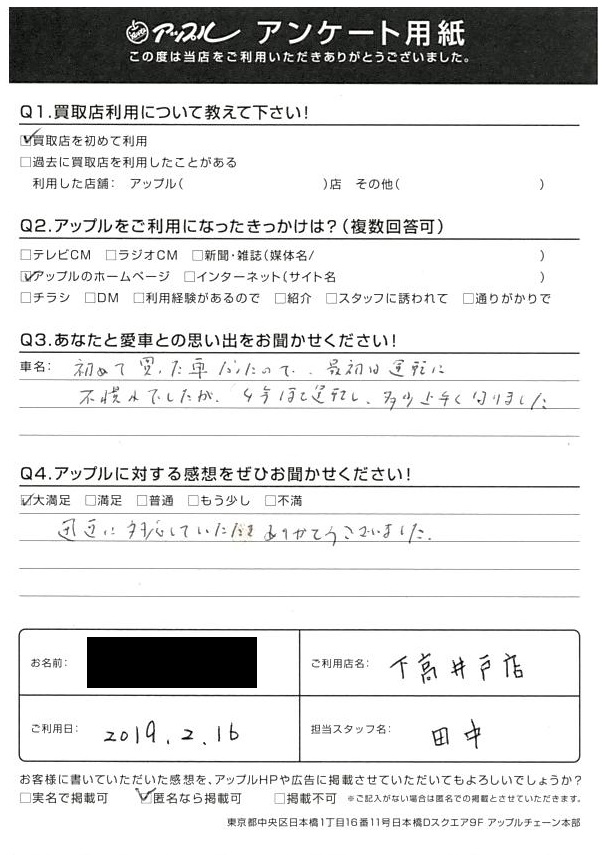 下高井戸店の営業マンの方は、対応が迅速で、提示価格について理由も詳しく説明していただくことができました。受付の情勢の方も、丁寧な対応をしていただき、売却が初めての私にとってとても助かりました。ありがとうございました。