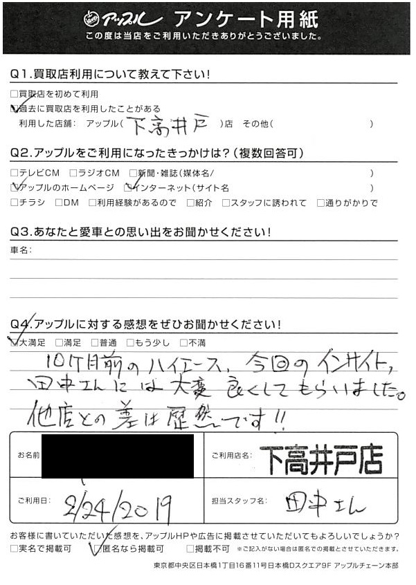 お車のご相談・ 査定だけでもOK! カンタン 入力 30秒 アップルがブランド買取始めました! お電話でも受付中! 受付時間10:00 ~ 19:00 0120-037-315 お車のご相談・ 査定だけでもOK! カンタン 入力 30秒 アップルがブランド買取始めました! お電話でも受付中! 受付時間10:00 ~ 19:00 0120-037-315 アップルがブランド買取始めました! お電話でも受付中! 受付時間10:00 ~ 19:00 0120-037-315 店舗情報 在庫車 スタッフ紹介 ブログ お客様の声 キャンペーン お得 無料査定 click お客様の声 ご記入日: 2019/02/24 東京都大田区 M様 車名:ホンダ インサイト Q アップルに対する感想をぜひお聞かせください! 10ヶ月前のハイエース、今回のインサイト、田中さんには大変良くしてもらいました。 他社との差は歴然です!! 前へ 次へ お客様の声一覧を見る