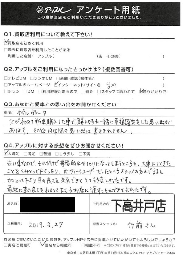 神奈川県横浜市 ご来店日:2019/3/27 I様 車名:オペル ヴィータ