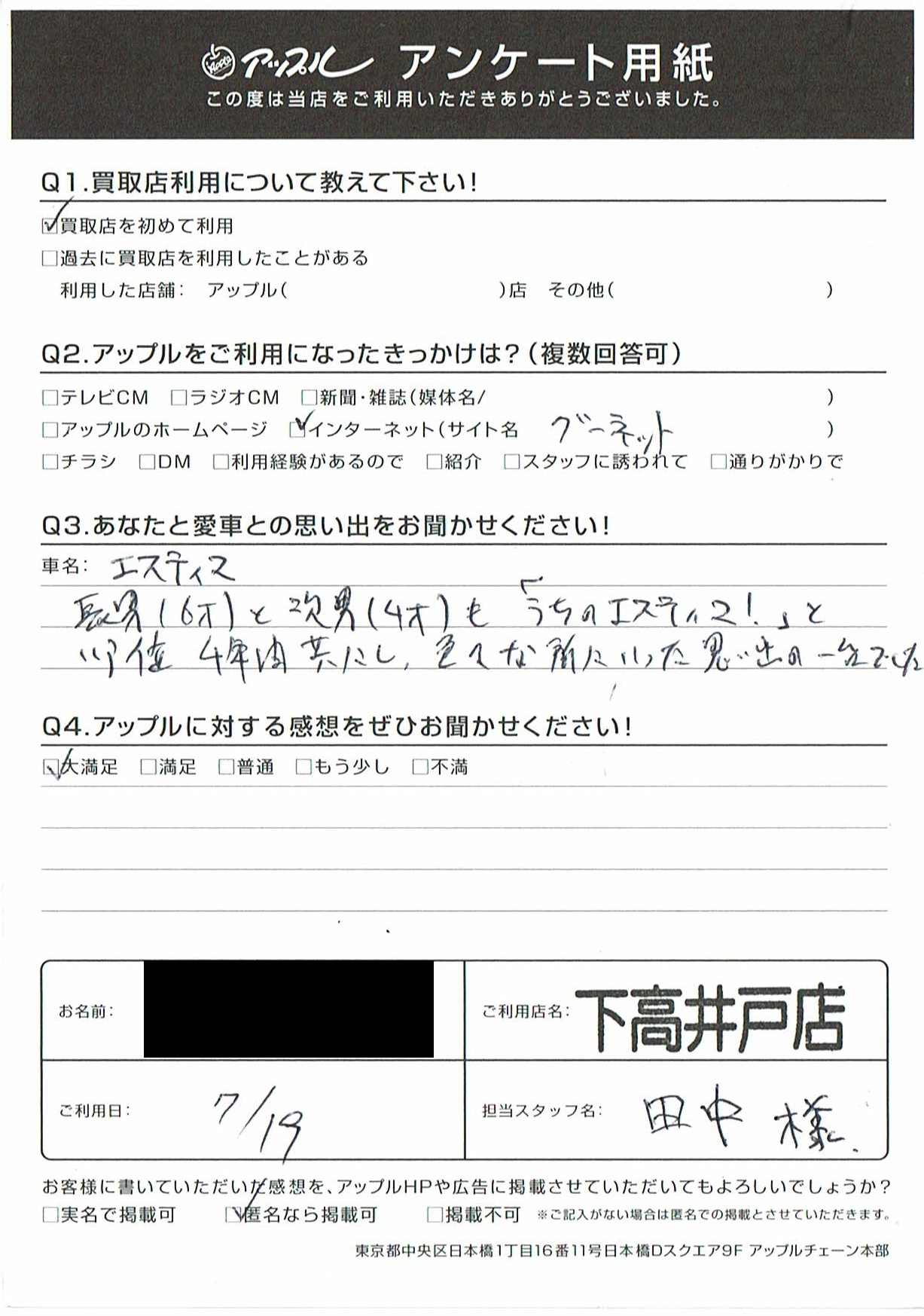 お車のご相談・ 査定だけでもOK! カンタン 入力 30秒 アップルがブランド買取始めました! お電話でも受付中! 受付時間10:00 ~ 19:00 0120-037-315 お車のご相談・ 査定だけでもOK! カンタン 入力 30秒 アップルがブランド買取始めました! お電話でも受付中! 受付時間10:00 ~ 19:00 0120-037-315 アップルがブランド買取始めました! お電話でも受付中! 受付時間10:00 ~ 19:00 0120-037-315 店舗情報 在庫車 スタッフ紹介 ブログ お客様の声 キャンペーン お得 無料査定 click お客様の声 ご記入日: 2019/10/09 東京都江東区 ご利用日:2019/7/19 K様 車名:トヨタ エスティマ Qあなたと愛車との思い出をお聞かせください! 長男(6才)と次男(4才)も「うちのエスティマ!」と 4年間共にし、色々な所にいった思い出の一台でした。 前へ 次へ お客様の声一覧を見る