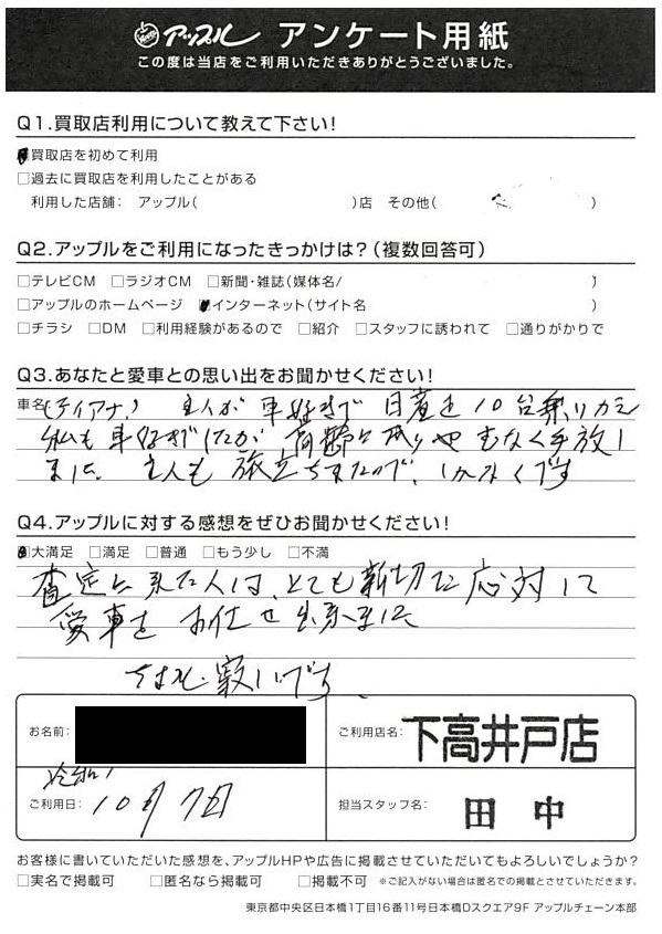 東京都世田谷区 ご利用日:2019/10/7 U様 車名:日産 ティアナ