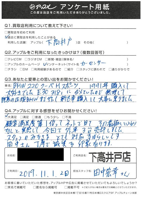 東京都杉並区 ご利用日:2019/11/1 N様 車名:BMW 2シリーズクーペ