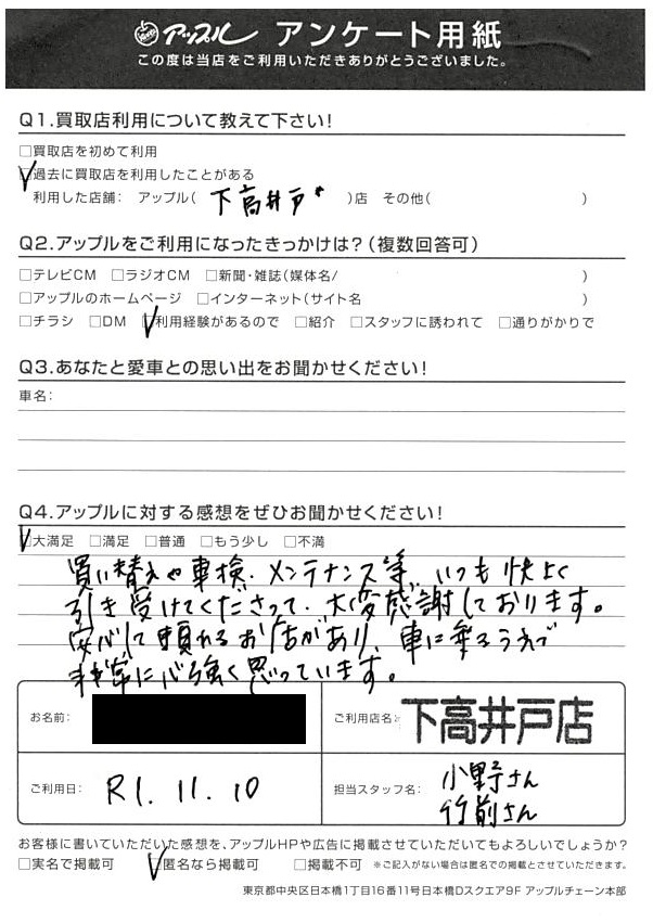 東京都世田谷区 ご利用日:2019/11/10 N様 車名:BMW 1シリーズ