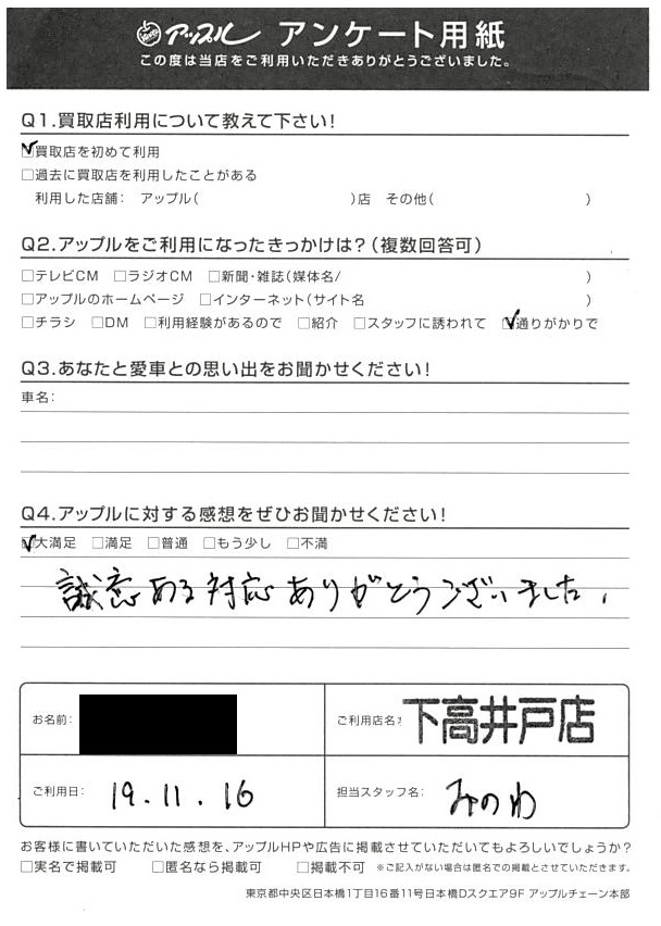 お車のご相談・ 査定だけでもOK! カンタン 入力 30秒 アップルがブランド買取始めました! お電話でも受付中! 受付時間10:00 ~ 19:00 0120-037-315 お車のご相談・ 査定だけでもOK! カンタン 入力 30秒 アップルがブランド買取始めました! お電話でも受付中! 受付時間10:00 ~ 19:00 0120-037-315 アップルがブランド買取始めました! お電話でも受付中! 受付時間10:00 ~ 19:00 0120-037-315 店舗情報 在庫車 スタッフ紹介 ブログ お客様の声 キャンペーン お得 無料査定 click お客様の声 ご記入日: 2020/02/24 東京都世田谷区 ご利用日:2019/11/16 N様 車名:BMW 1シリーズ Q アップルに対する感想をぜひお聞かせください! 誠意のある対応ありがとうございました。 前へ 次へ お客様の声一覧を見る