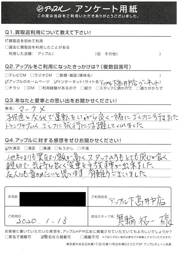 東京都世田谷区 ご利用日:2020/1/13 Y様 車名:トヨタ マークX